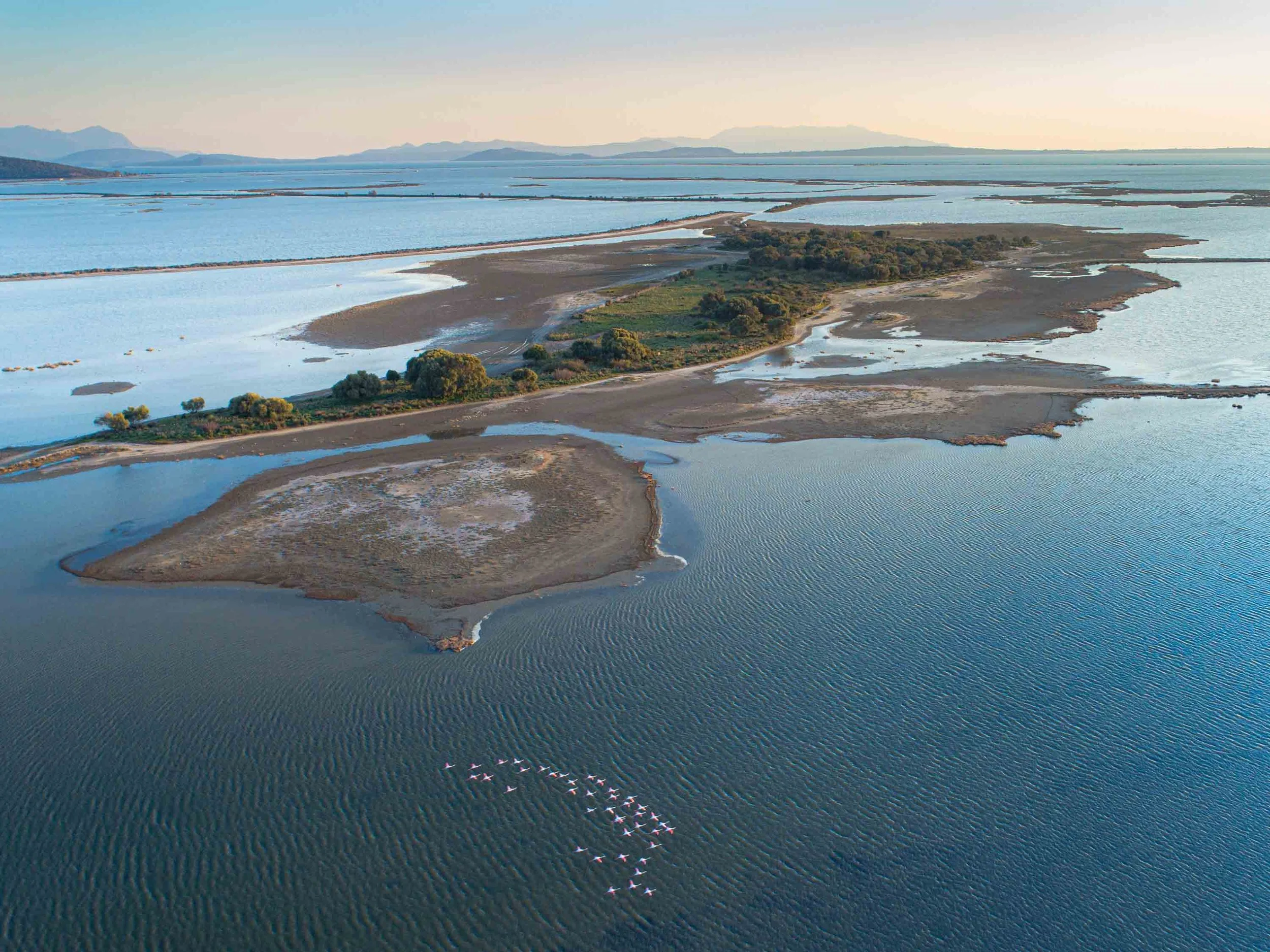 Flamingos over the wetland near the village of Vigla.